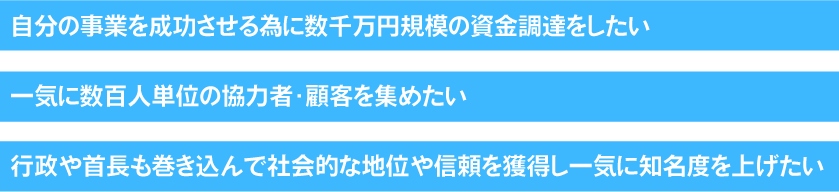 普通では会えなかった、県知事や市長からも応援され、そのプロジェクトに信頼が担保される事で、有名企業の社長であったり沢山の人から注目され応援してもらえます。
