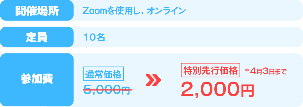 また、大切なお時間と5000円をいただくわけですから、私も本気で参加者様と向き合い情熱をお伝えさせていただきたく思い、自分へプレッシャーをかけることも考えこの価格にさせていただきました。